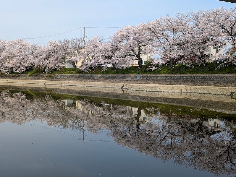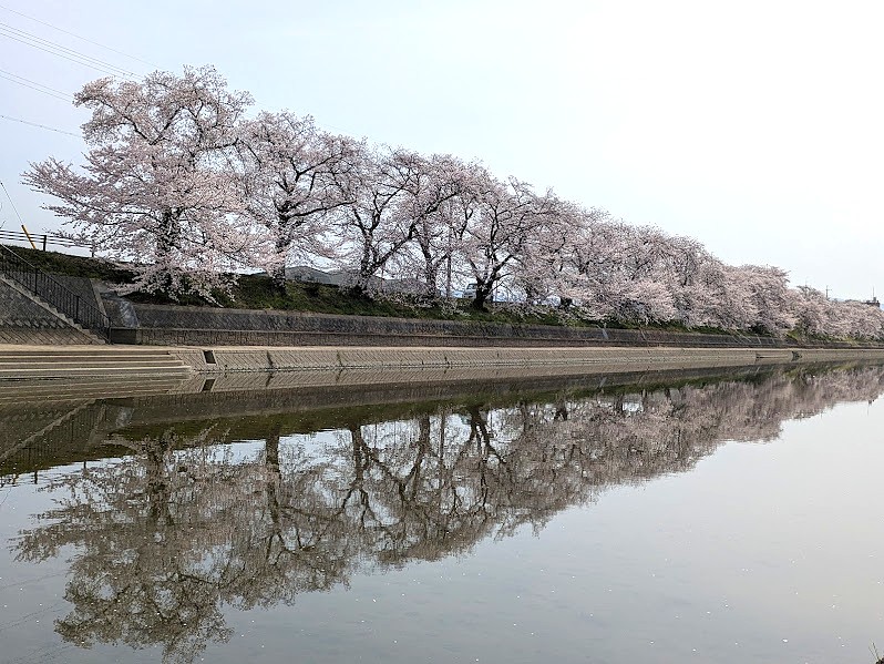 前川は殆ど流れが無く、水面が穏やかなため、川の水面に桜が鏡のように映り込む現象(水鏡=リフレクション)が起きやすく、幻想的な逆さまの世界を楽しむことができます。