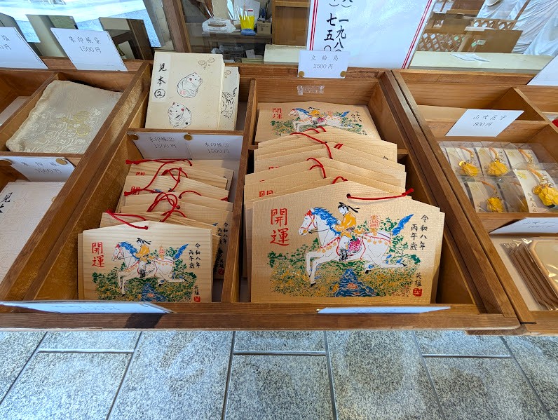 社務所では、同じ絵柄の干支絵馬が授与されます。初穂料は、 大(1,000円)、小(700円)、立絵馬(2,500円)です。