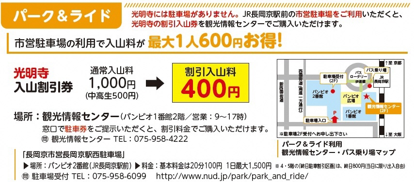 光明寺には駐車場がありません。JR長岡京駅前の市営駐車場(4階・5階)をご利用いただくと、 光明寺の割引入山券を観光情報センターでご購入いただけます。