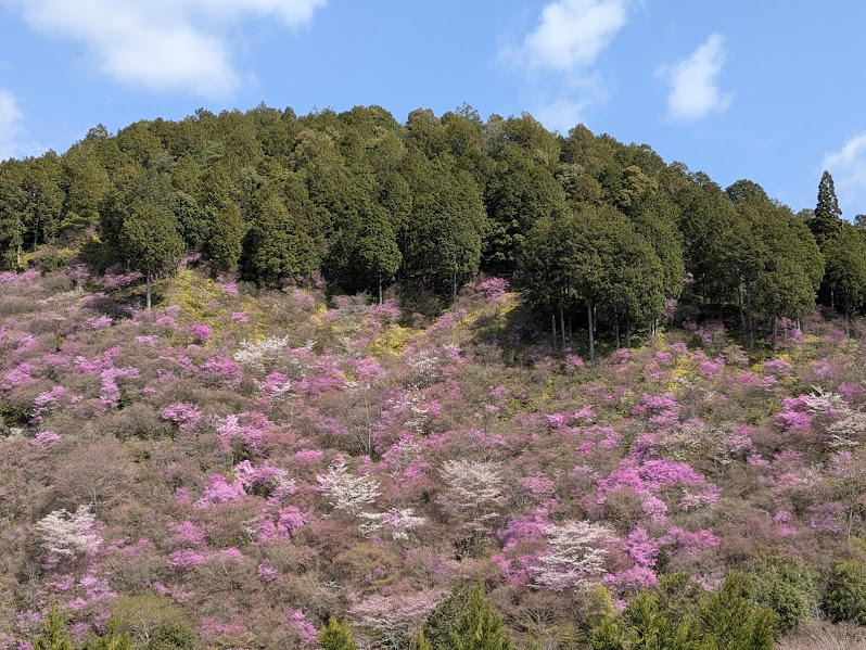 山の斜面がヤマザクラの薄紅色、ミツバツツジの濃紅色に染め上げられ、壮麗な風景を見せてくれます。