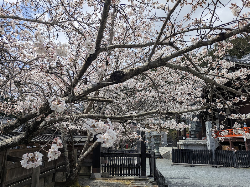 桜の本数は決して多くはありませんが、紅しだれ桜が咲き、仁王門(三解脱門)、大本堂、鐘楼堂を濃紅色に染め上げます。