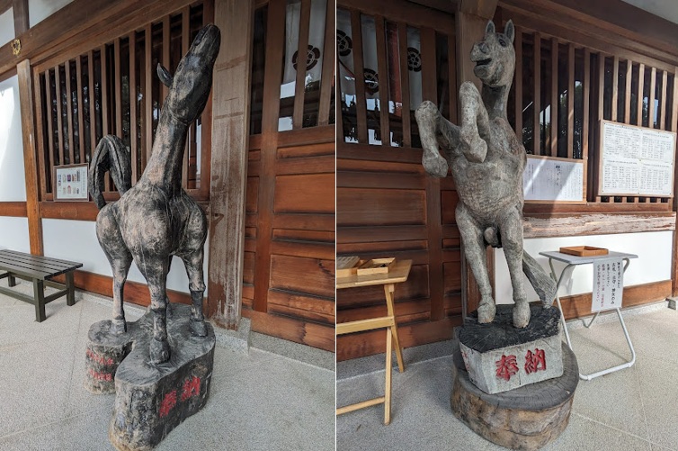拝殿前の左右両側には2体の馬を模った木彫りの像が奉納されています。