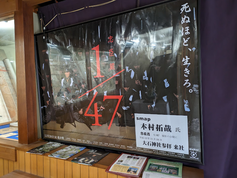その他にも、平成13年(2001年)放送のドラマ「忠臣蔵1/47」にて、堀部安兵衛役を演じた木村拓哉さんが、撮影の際に神社を訪れた時の写真も展示されています。