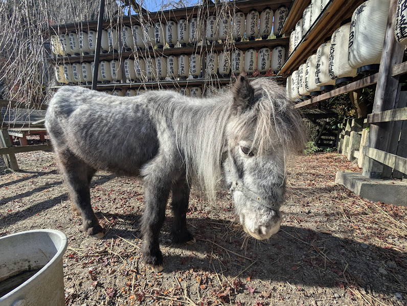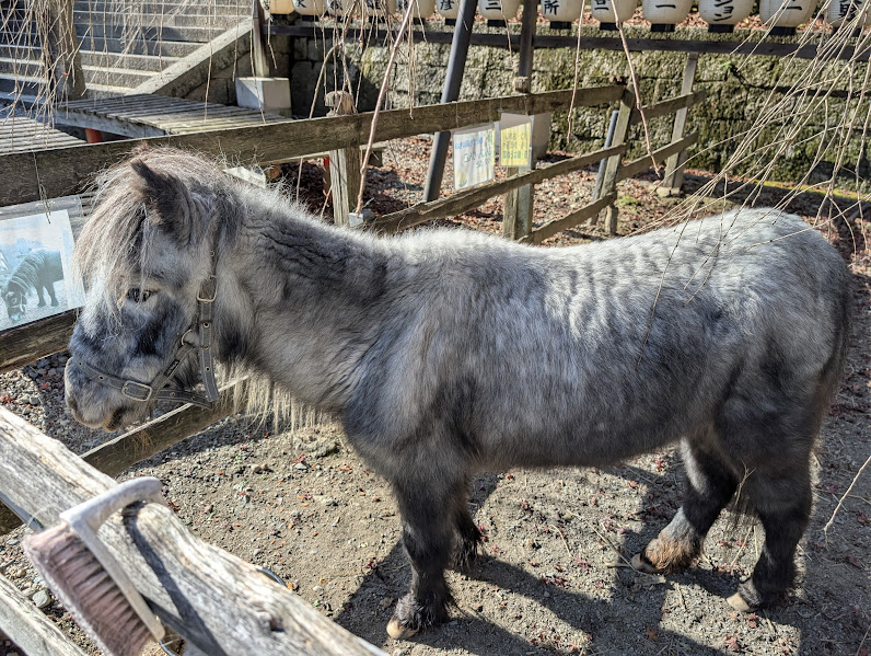 境内の一角(二の鳥居の横)で、大石神社のアイドルの 可愛いミニホースを飼っています。