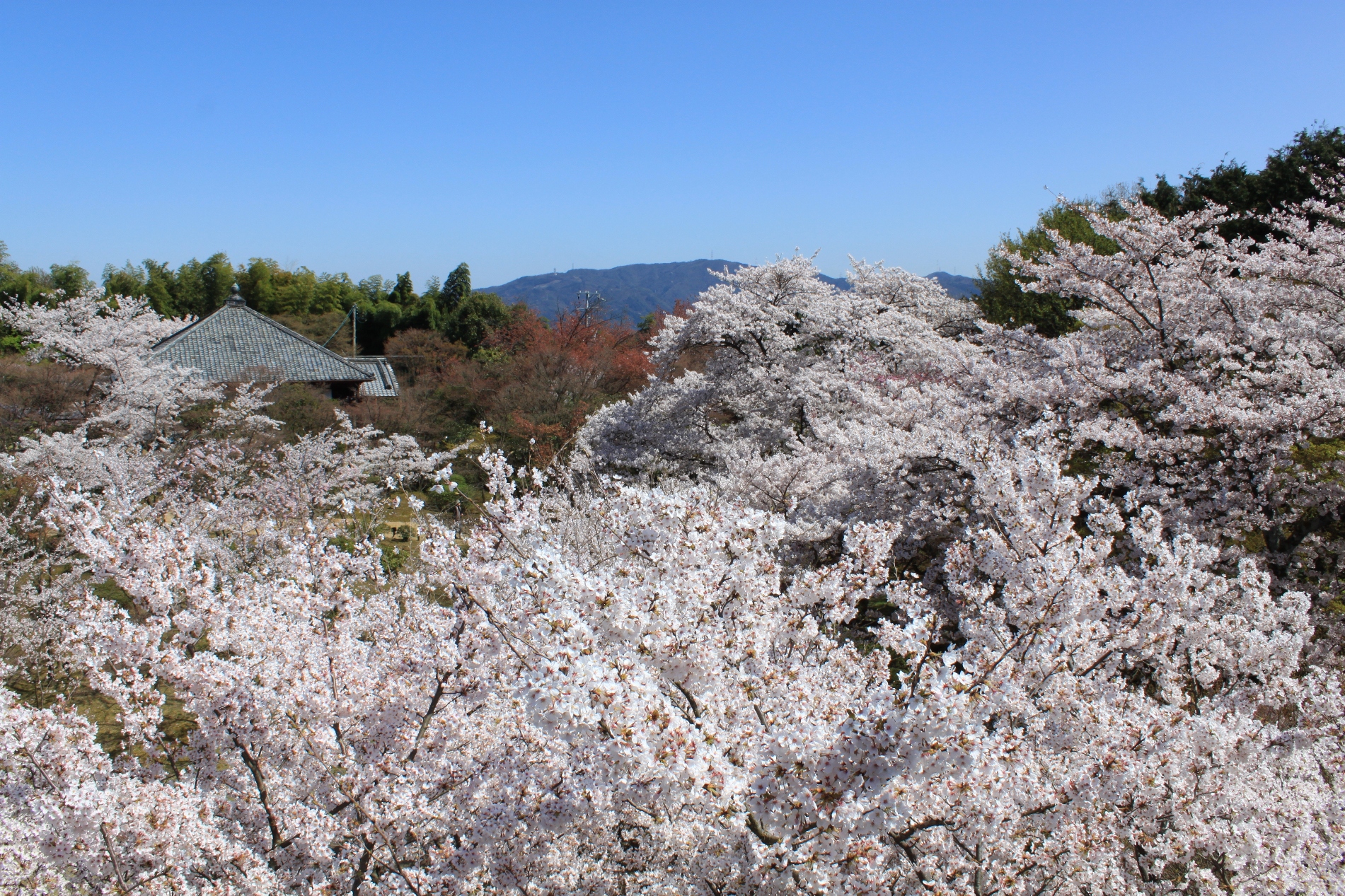 大舞台からの眺望も絶景のひと言。広大な舞台からは、京都の町並みと桜が眼下に広がります。