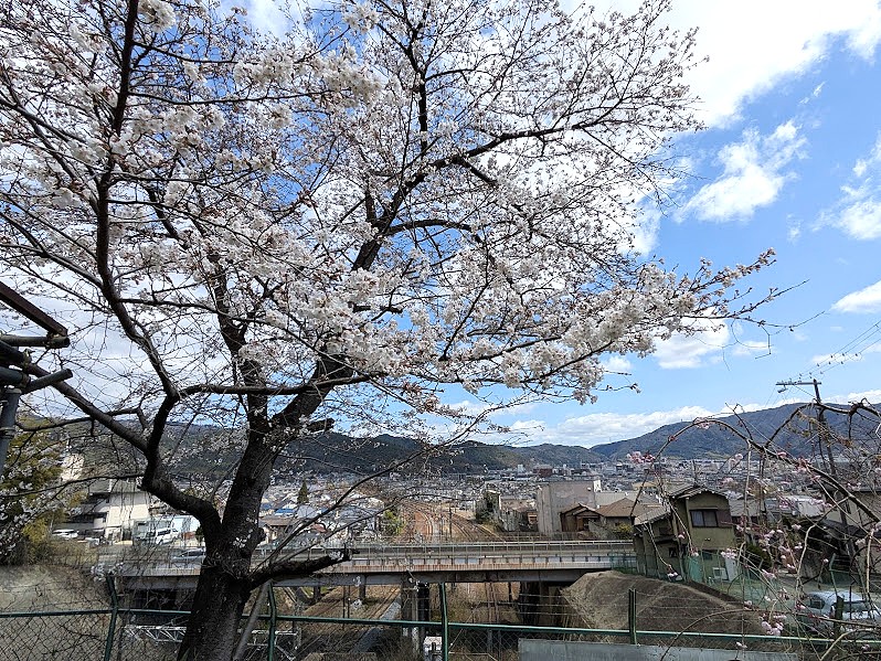 遮る建物が何も無く、桜越しにはJR東海道本線の線路と山科の町並みが一望です。