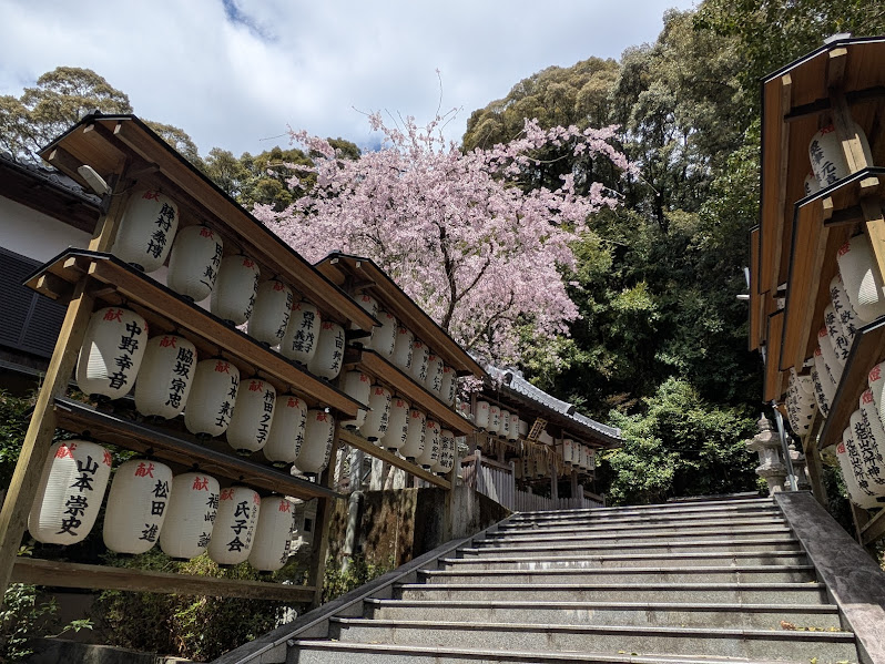 桜で彩られた鳥居をくぐると、石段の参道脇に奉納提灯を背景に桜を見ることができます。