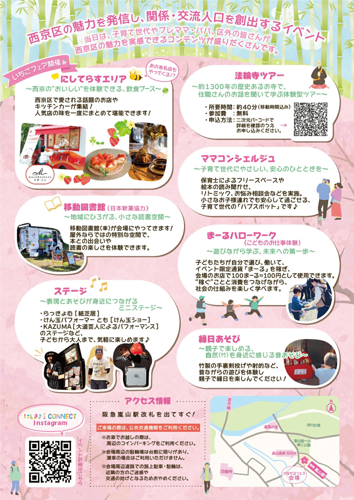 京都市西京区役所では、嵐山エリアにおいて、地元の方や子育て世帯、区外の方(特に京阪神在住の方)等をターゲットに、西京区の魅力を発信し、関係・交流人口を創出するイベントの第2弾として、2026年3月21日(土)に「嵐山えきまえつながるフェス にしきょう CONNECT」を阪急嵐山駅前広場にて開催します。