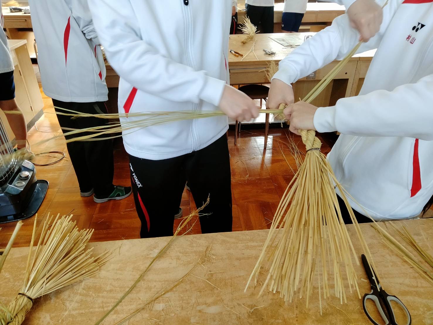 山国神社訪問後、元京北第二小学校内で、わらそぐり(稲わらを整える作業)や、わら細工(しめ縄やクリスマスリース/各自持ち帰り)を体験。