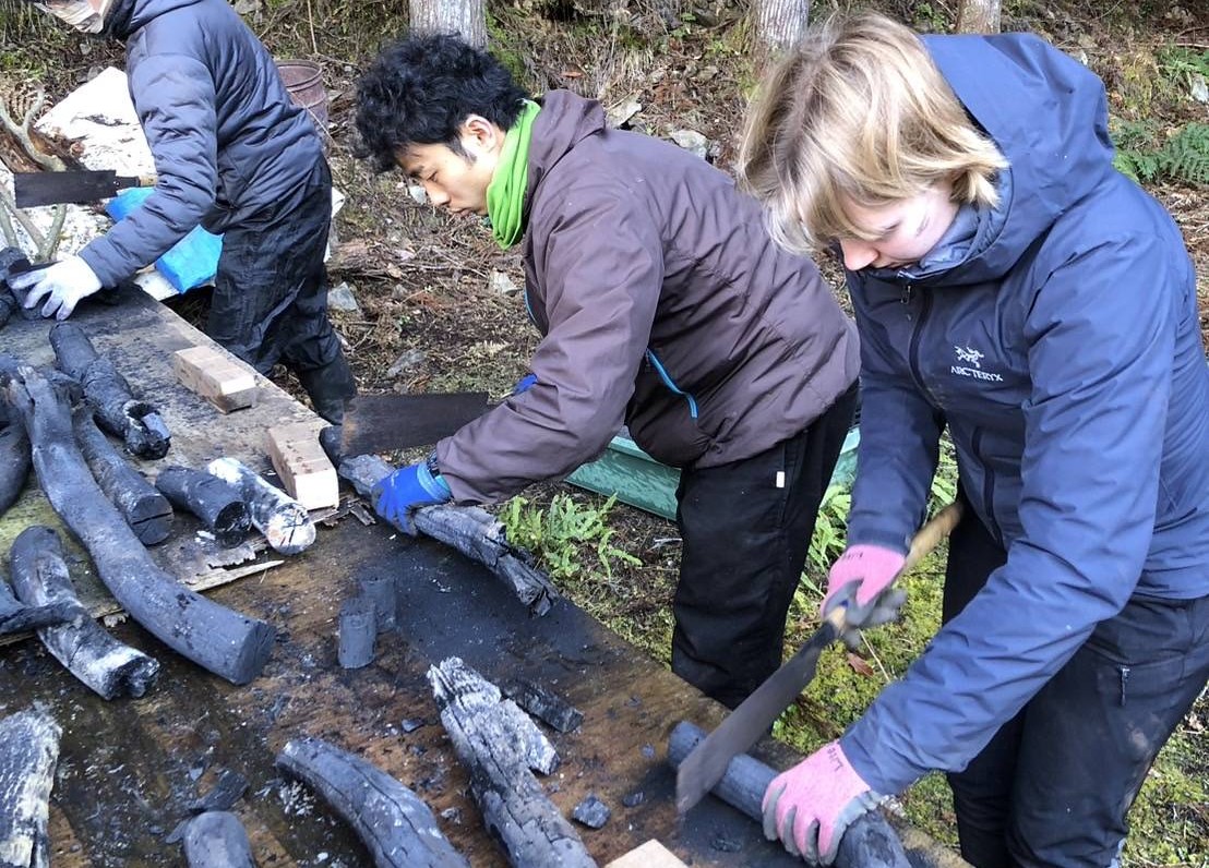 炭焼きの手法や歴史について説明、炭焼き窯への窯入れ・炭切り体験、昼食(お弁当)、炭ぼんさいづくり(各自持ち帰り)、薪割り体験(薪を使った生活スタイルの見学あり)