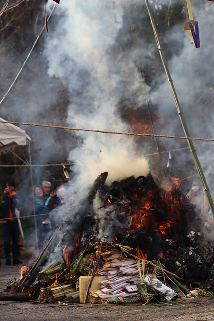 長い竹を組んで立て、その年の門松や注連飾、書き初め等を集めて焼きます。