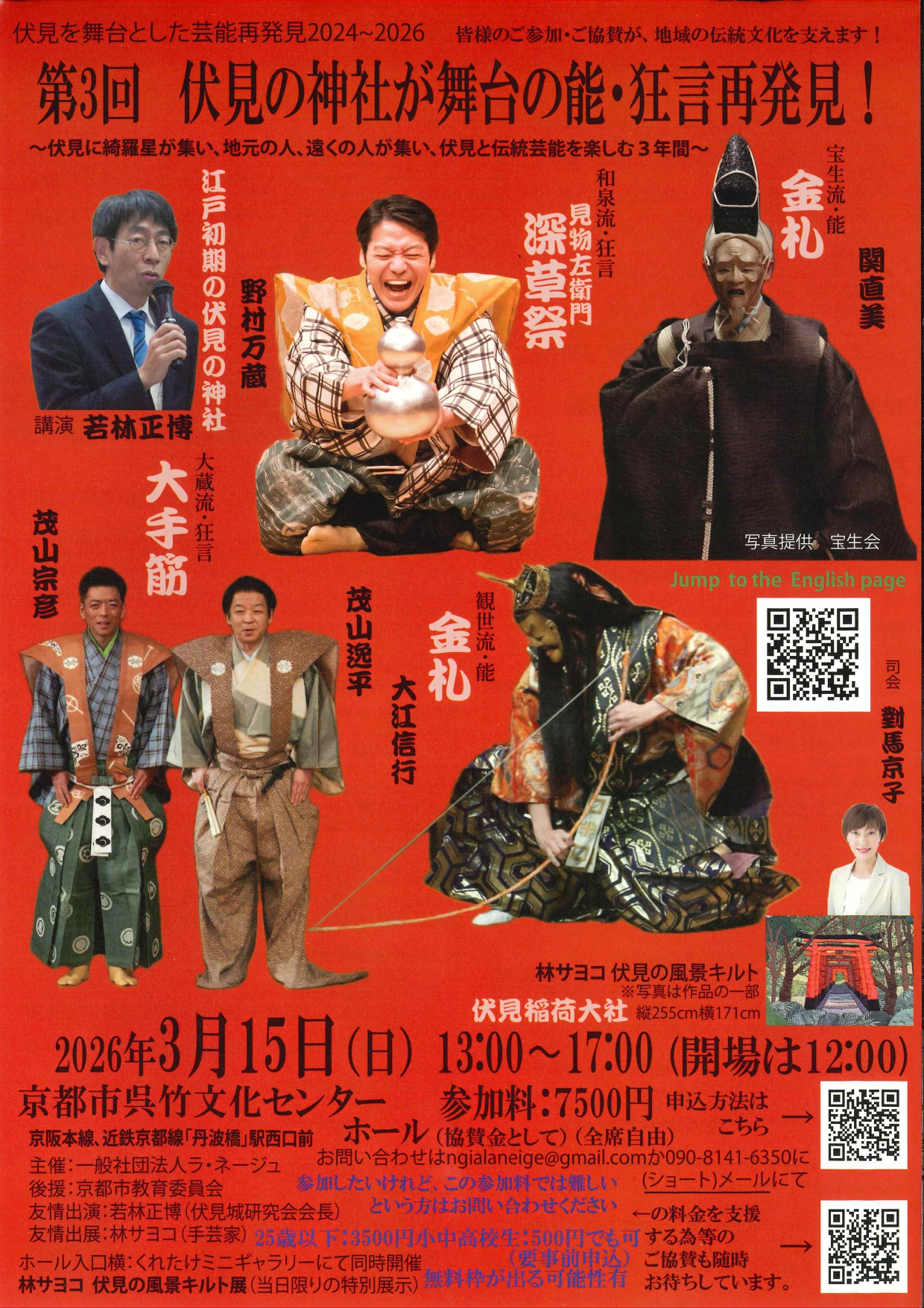 そして2026年は、能と狂言を地元の 観世流、大蔵流の皆様に加えて、 東京から宝生流、 和泉流の皆様をお招きし 、「第3回伏見の神社が舞台の能・狂言再発見!」を京都市呉竹文化センターにて、3月15日(日)に上演します。