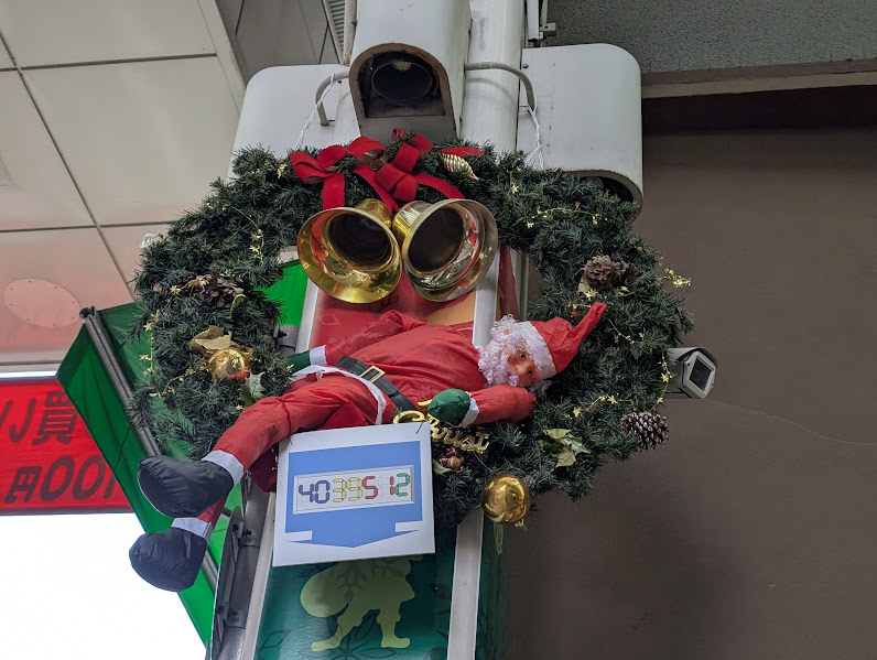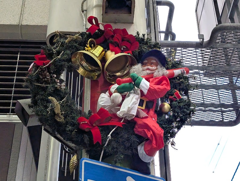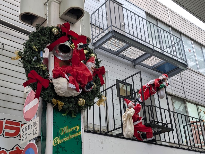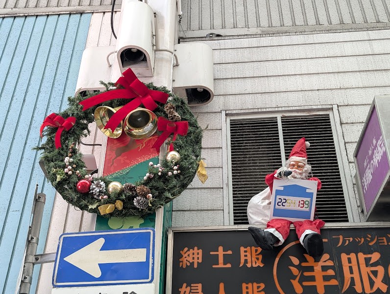 商店街アーケードのいたるところにサンタクロースの人形やリースがたくさん飾られます。