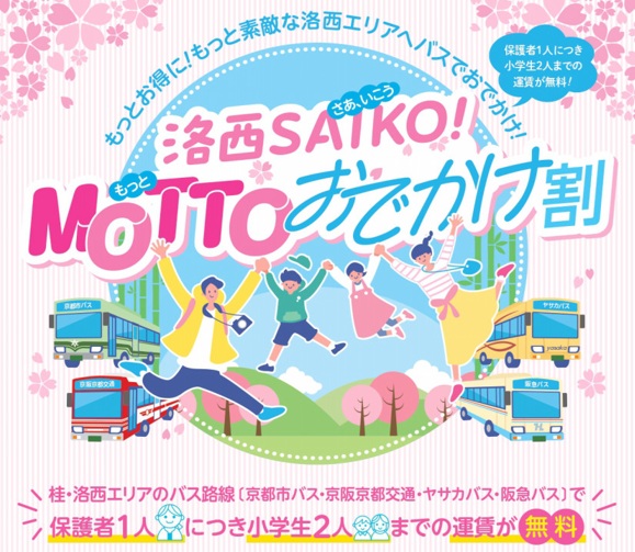京都市交通局では、春休み期間に「洛西“SAIKO”(さあ、いこう)プロジェクト」の一環として、子育て世代への応援および子育て世代にやさしいまちであることを交通の側面から支援するため、京阪京都交通株式会社、阪急バス株式会社、株式会社ヤサカバスと協調し、地域限定で「洛西SAIKO!MOTTO(もっと)おでかけ割」を実施します。